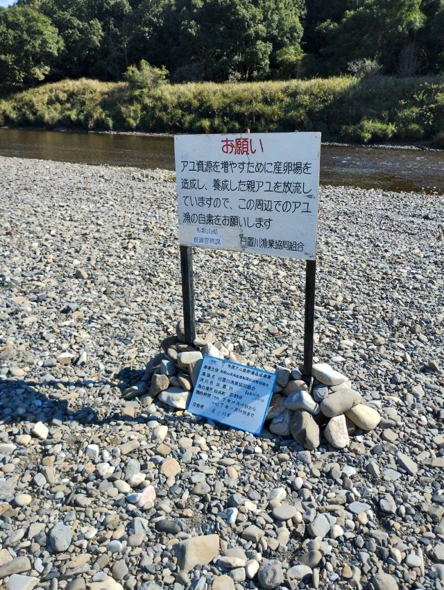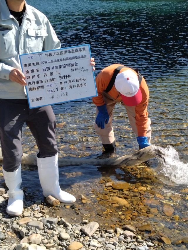 | 10/28(火)に田野井で産卵場造成事業、親鮎の放流を行いました。 無事に産卵して、来年日置川に帰ってきてほしいですね! | ![]() |
